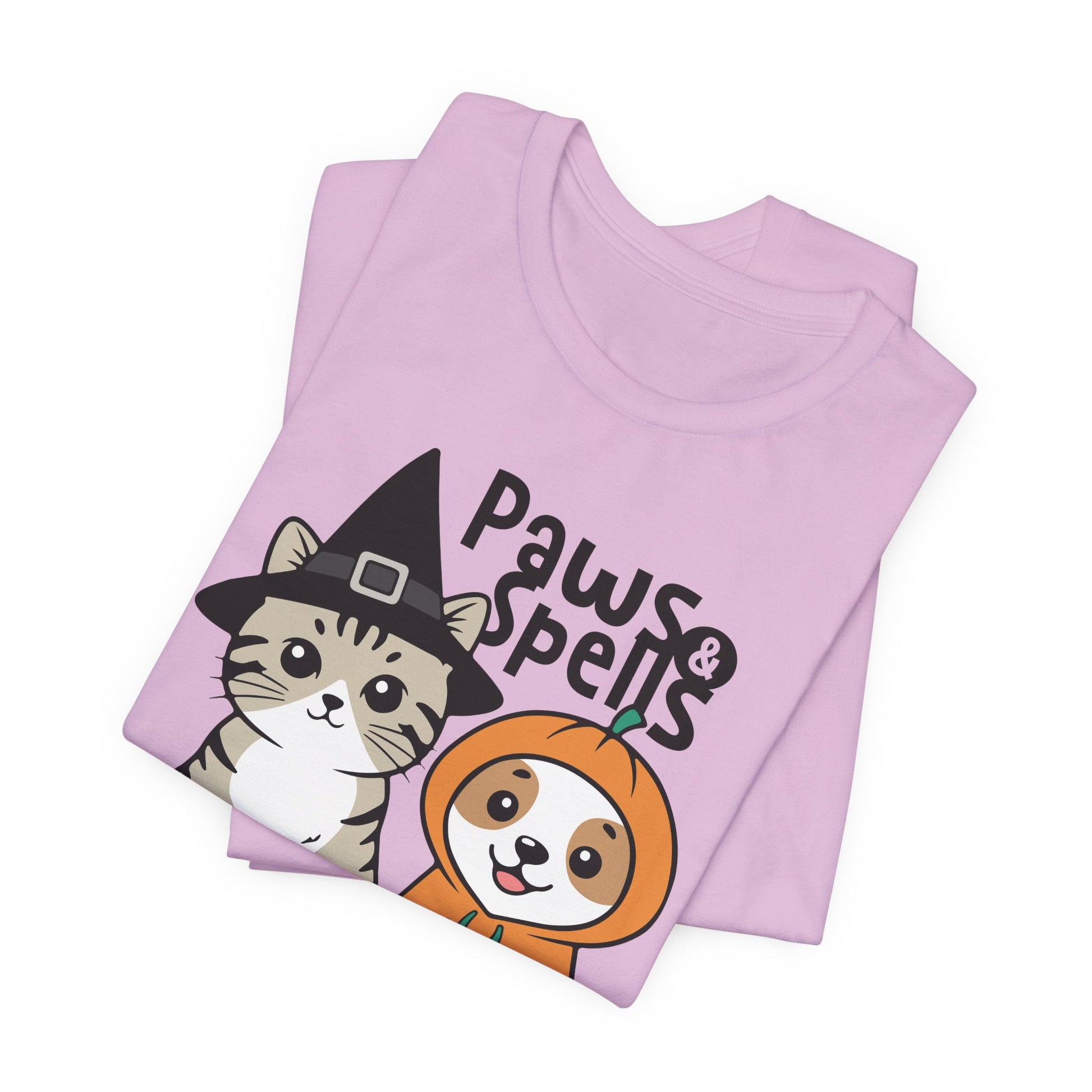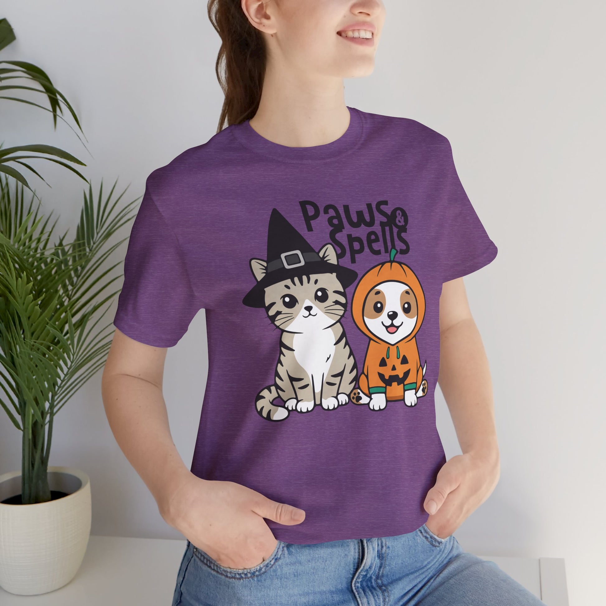 Bring Halloween fun to life with this adorable cat and dog t-shirt! Featuring a sweet kitty in a witch hat and a playful puppy dressed as a pumpkin, this graphic tee adds charm and festive spirit to your style. Comfortable, soft, and lightweight, it’s perfect for parties, trick-or-treat nights, or cozy fall days.