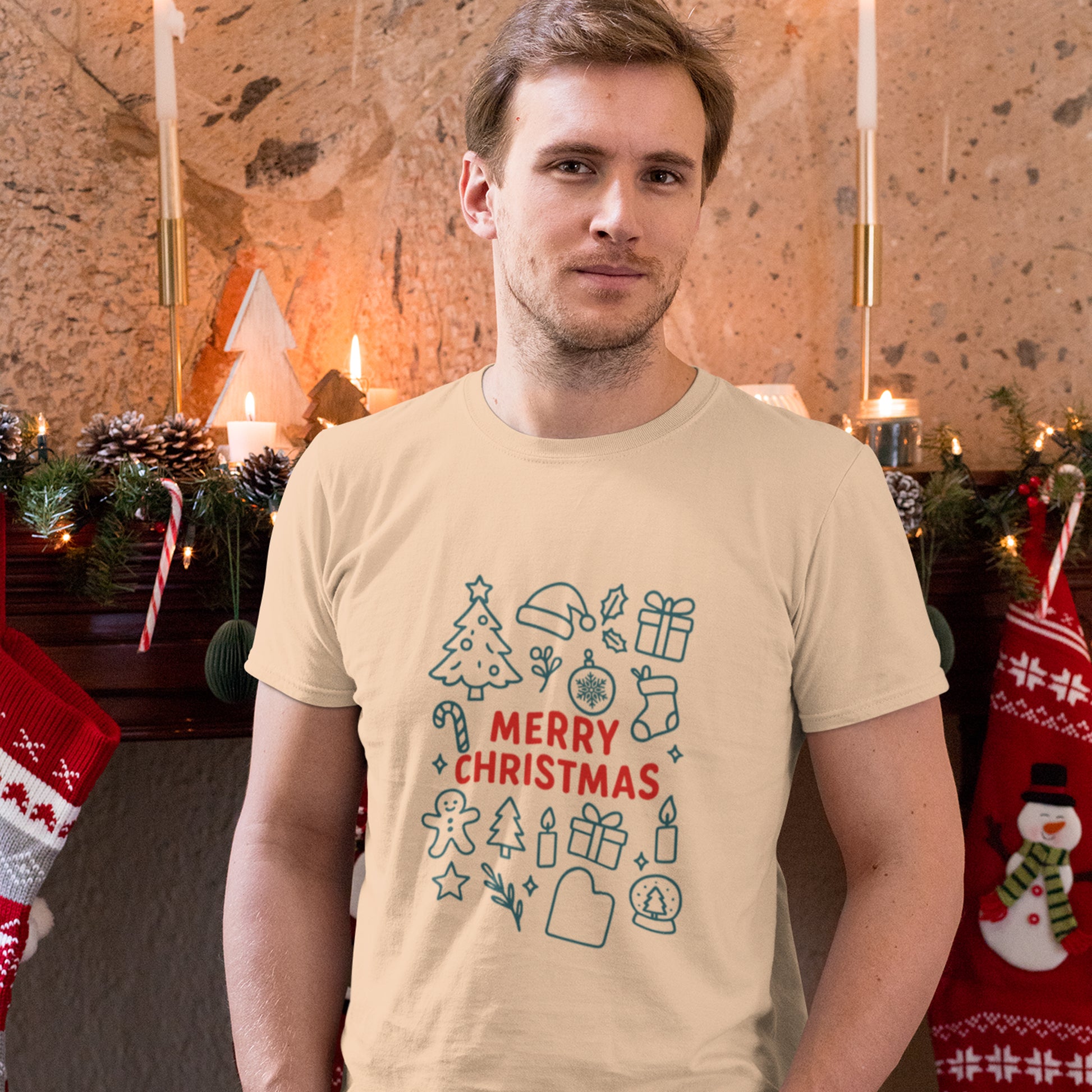 Celebrate the holidays in style with this minimalist Merry Christmas t-shirt featuring clean line-art icons like trees, gifts, stockings, candles, and ornaments. The bold red lettering adds the perfect festive touch while keeping the design modern, simple, and easy to pair with any outfit.
